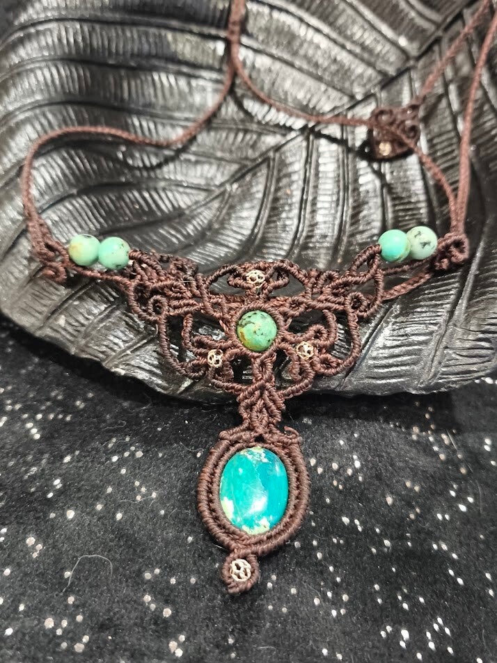 Je vous présente un collier multi-positions en macramé avec son cabochon de turquoise africaine de 14 × 10 mm.
