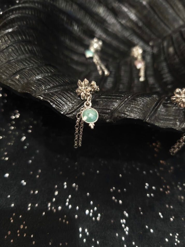 Je vous présente des paires de boucles d’oreilles sur clou en forme de Sakura en argent ornées avec des breloque en pierres naturelles et chainettes en argent.