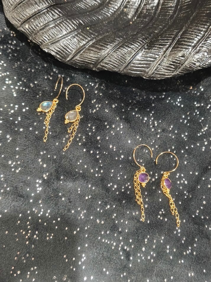 Boucles d'oreilles crochet en or laminé avec ses pierres naturelles facettées,ornées de petites chainettes.