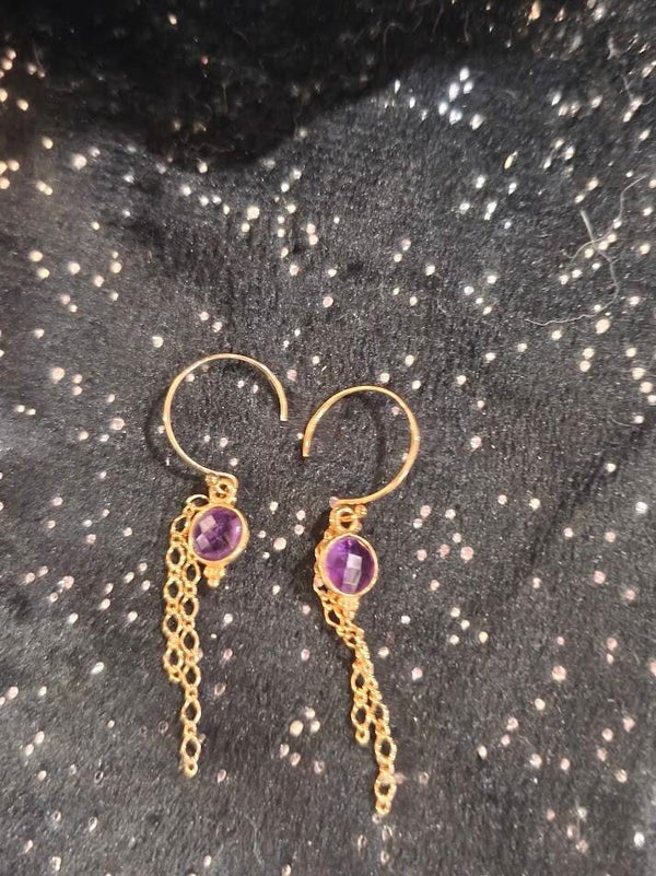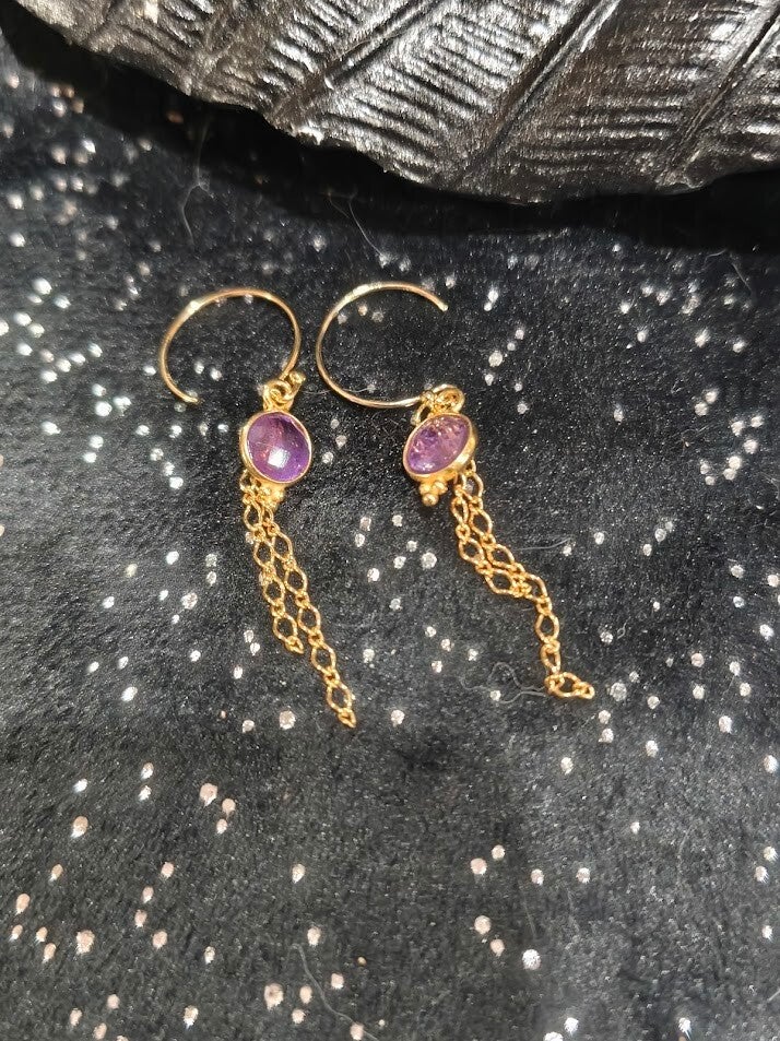 Boucles avec de l'amésthyste ronde et chainettes en or laminé.