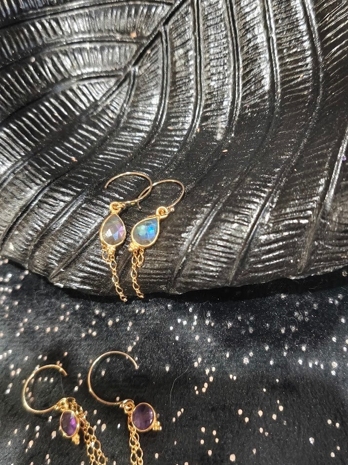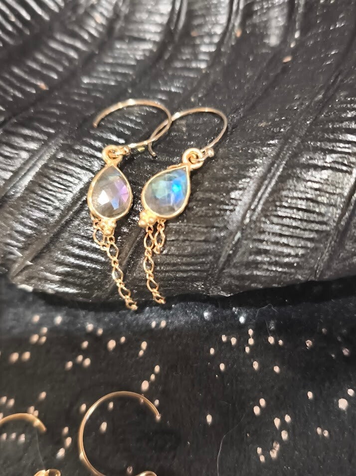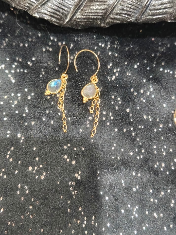 Boucles avec de la labradorite en goutte et chainettes en or laminé.