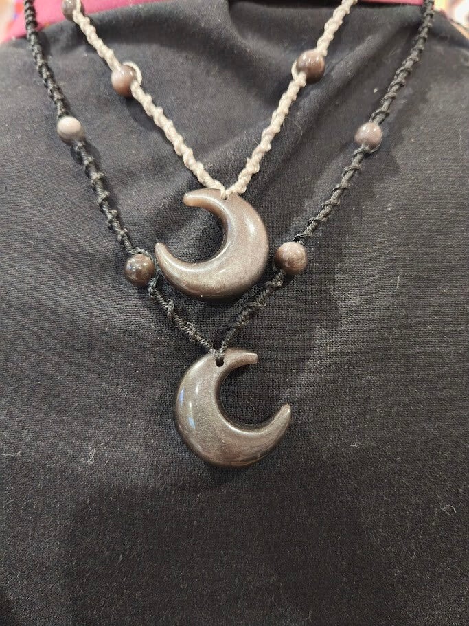 Vous trouverez sur ses collier une lune taillee dans l'Obsidienne accompagne des ses perles d'Obsidienne en 8mm et 6 mm.