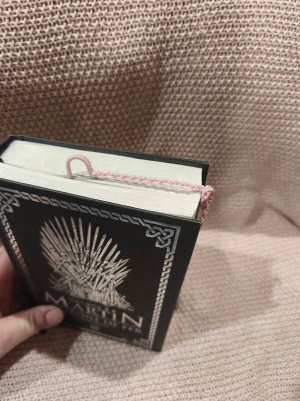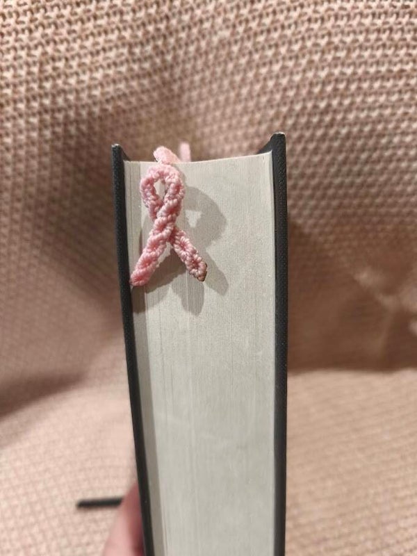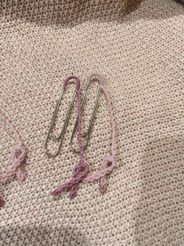 Je vous propose un trombone pour utilisation en marque page décoré de macramé avec au bout d'un lien macramé se trouve le ruban réalisé en macramé aussi.