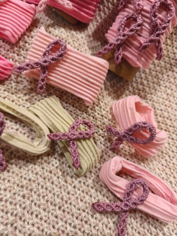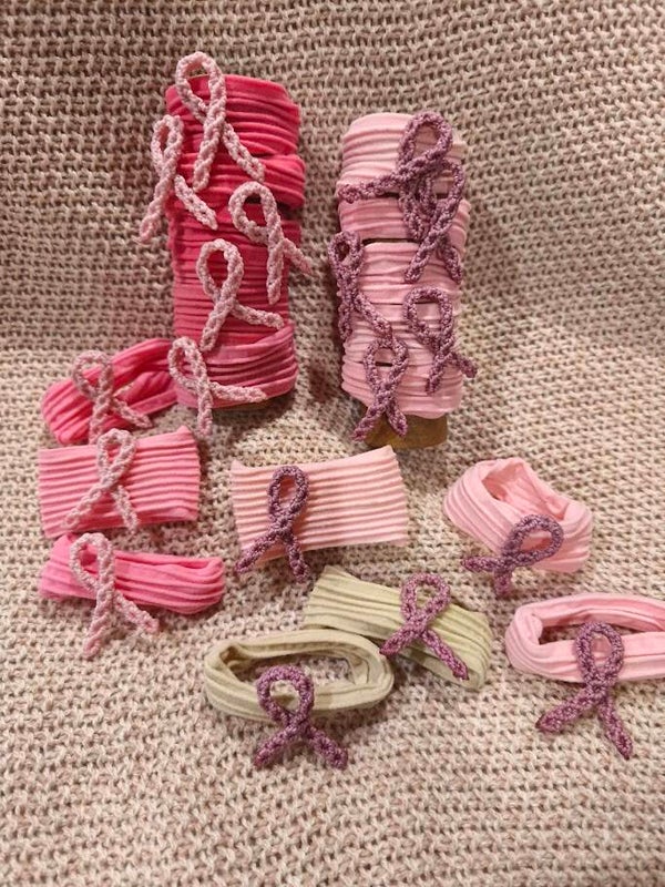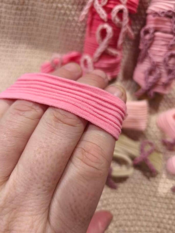 Je vous propose des élastiques tissus avec ruban en macramé de la lutte contre le cancer du sein.